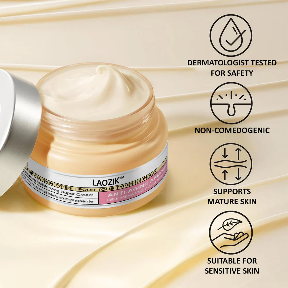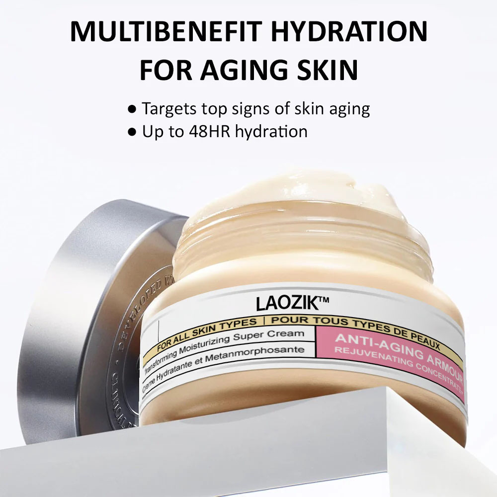 O creme hidratante e firmador LAOZIK™ utiliza ingredientes de alta qualidade para maximizar a eficácia, retendo a hidratação, estimulando a produção de colágeno, suavizando rugas e reparando danos, sendo adequado para peles sensíveis.